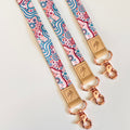 Each lanyard features a safety clasp at the neckline, a chic faux leather trim, and a sturdy rose gold clasp.
