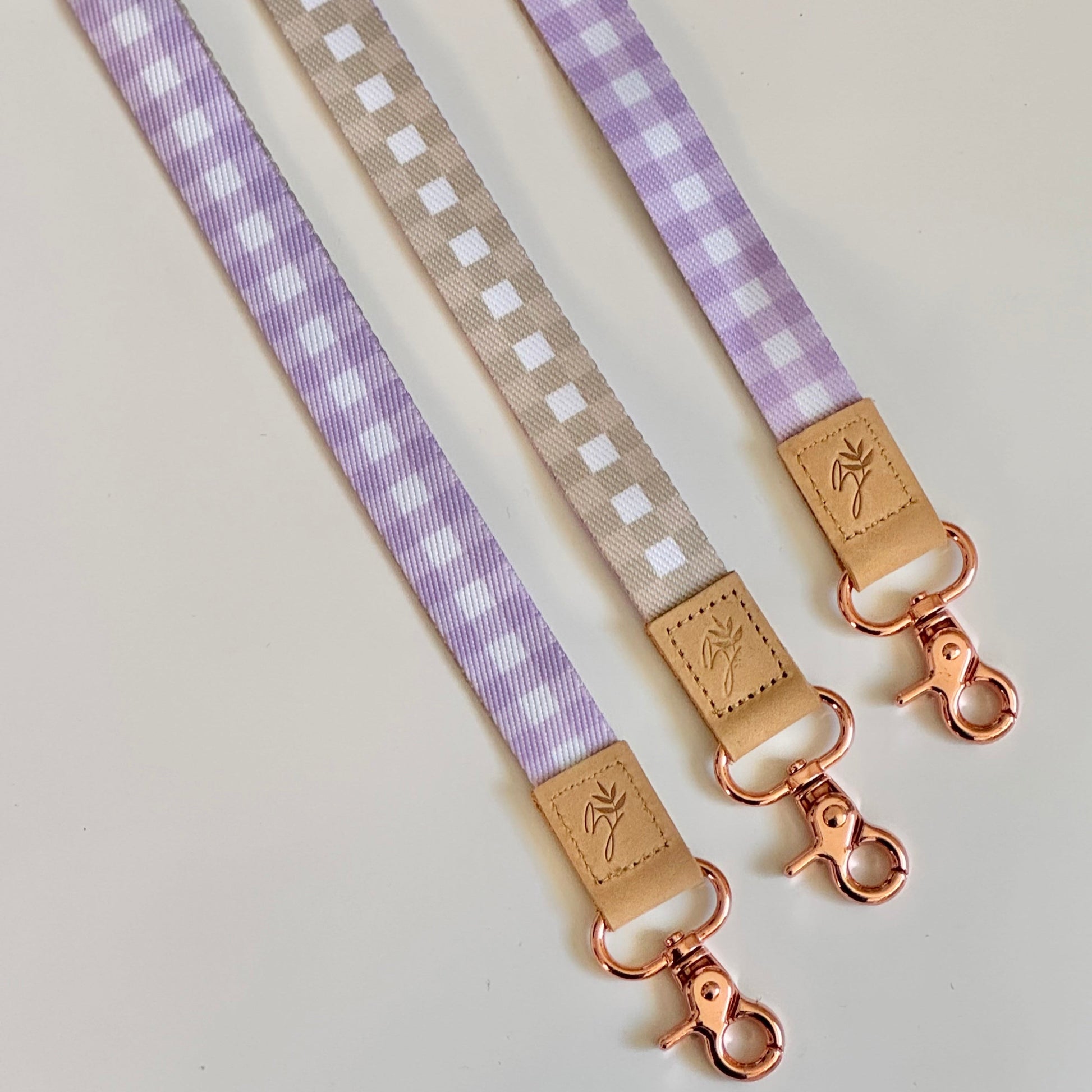 Each lanyard features a safety clasp at the neckline, a chic faux leather trim, and a sturdy rose gold clasp.