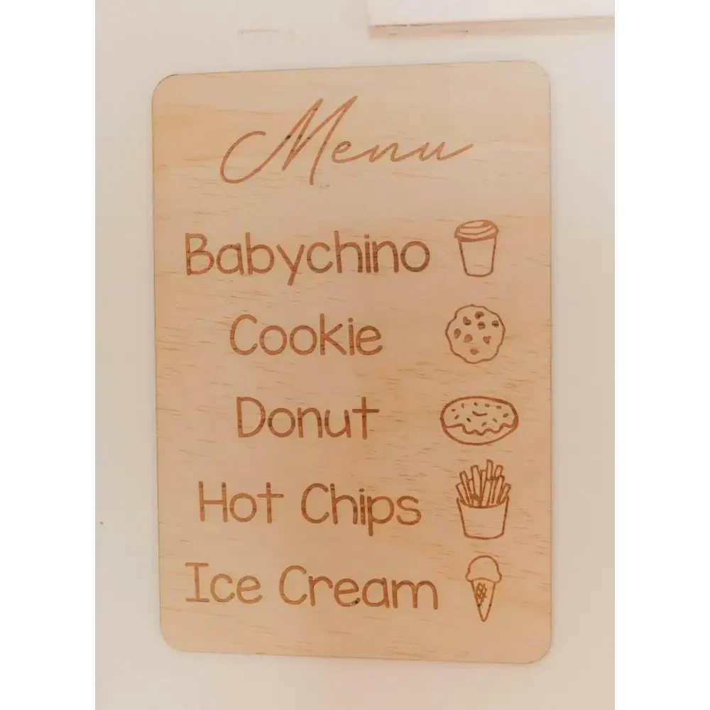 Our kids Menu is a cute addition to any kids playroom, cubby house or cafe.