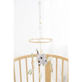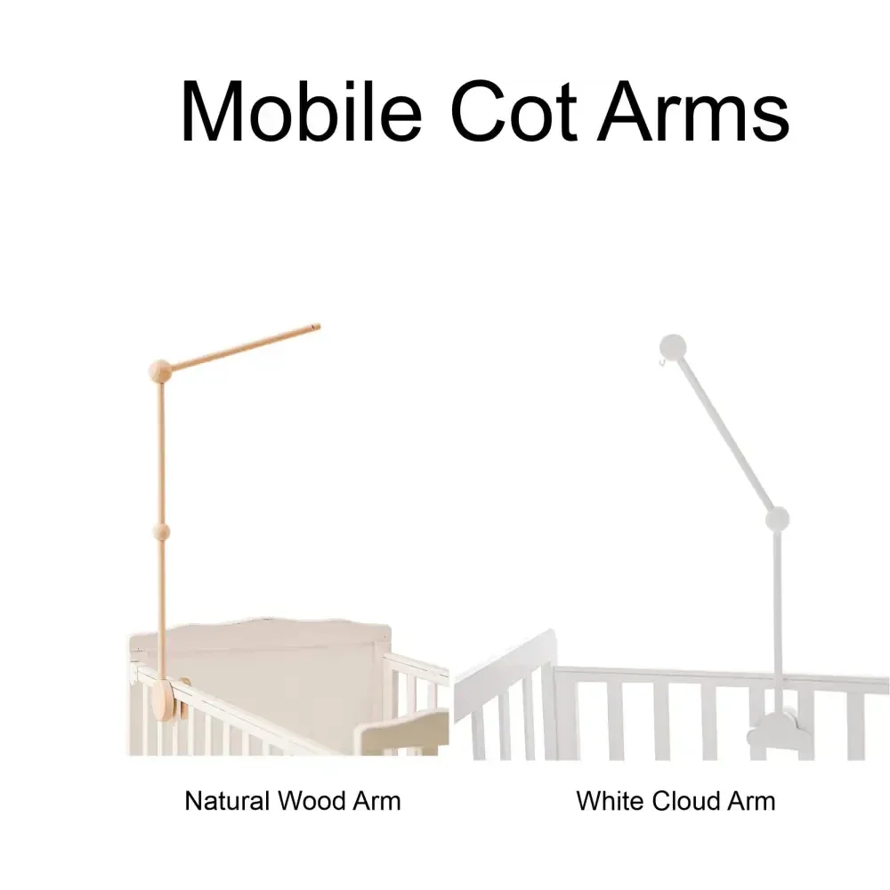 Attach the wooden arm to the side of the crib. Adjust the height and angle to suit your baby's line of sight. The grooves at the top make it easy and secure to hang the mobile.