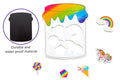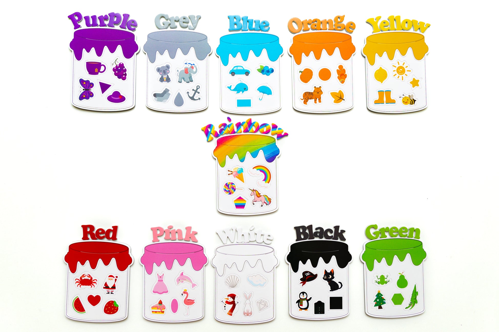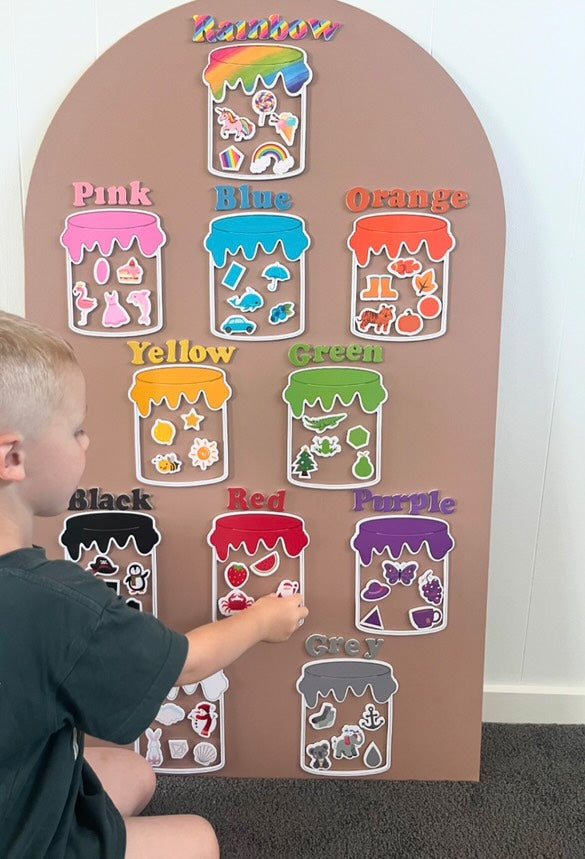The set includes 11 different colour candy jar frames and 121 colour recognition magnets featuring various objects such as letters, toys, food, stationery, and animals.