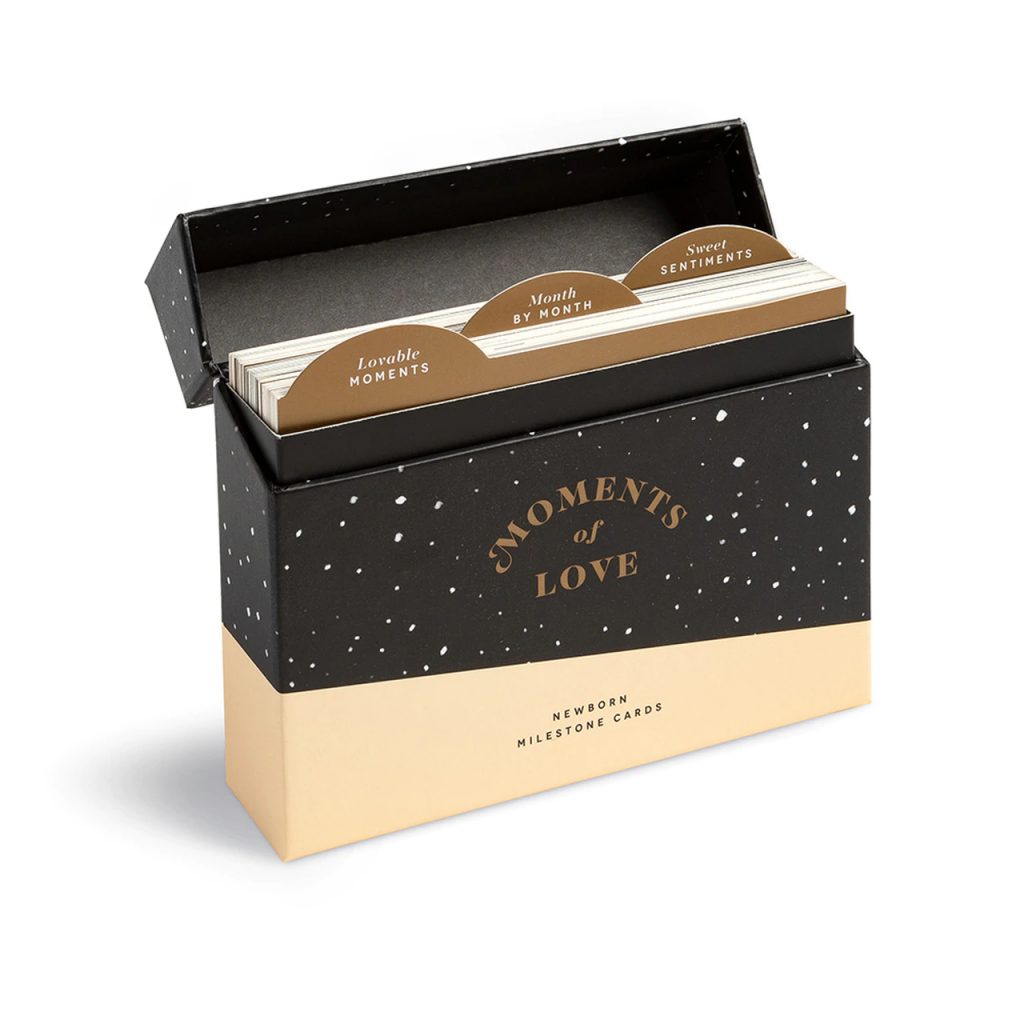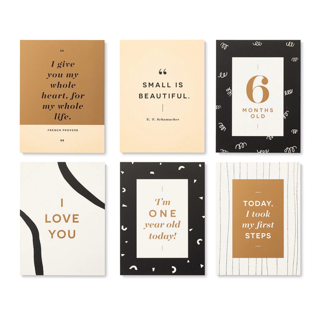 Newborn milestone cards, allow you to turn each photo you take into a beautiful memento. Inside this box of newborn milestone cards, you’ll find 45 sweet cards for capturing your anticipation, divided into three categories: