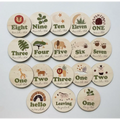 Specifications: This set includes 18 individual discs printed on quality 3mm timber, packaged in a beautiful calico cotton drawstring bag. Each disc is approximately 9.5 cm wide