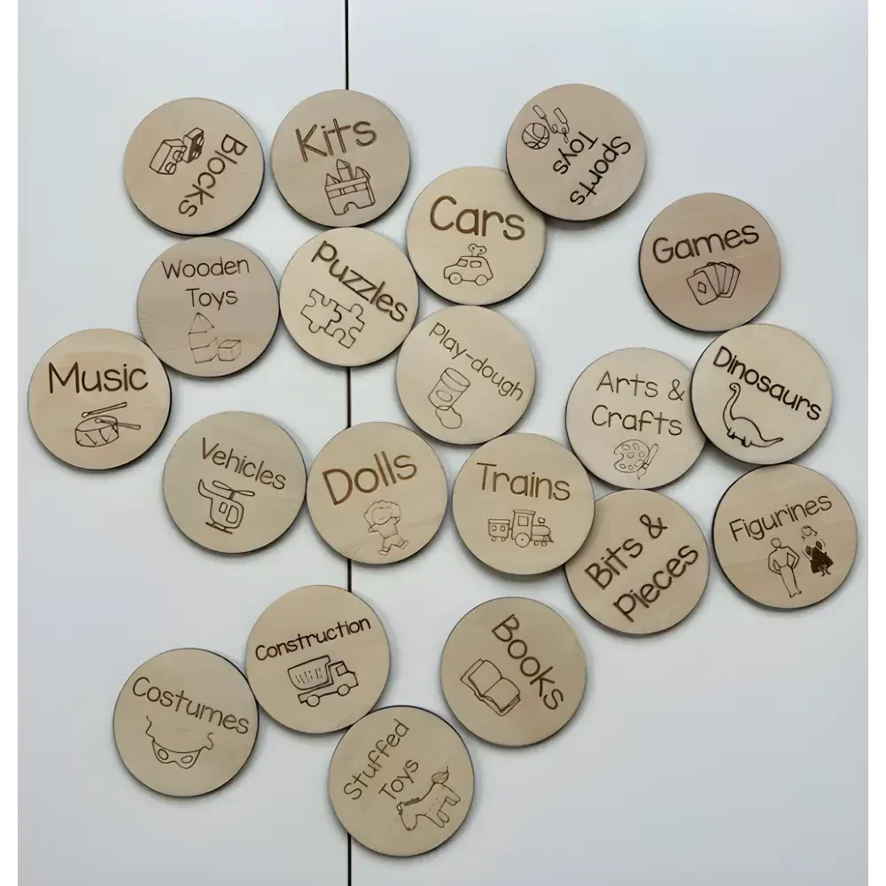 Toy Storage Labels are a great way to organise your playroom. Each tag features a unique graphic for your child to easily identify where each toy needs to be stored. Your choice to have holes or no holes on your tags.