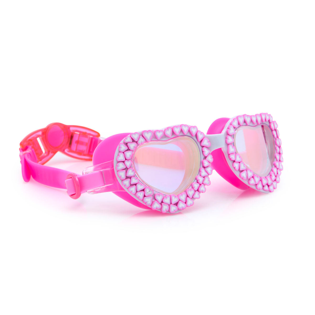 Summer starts in candy hearts! Dive into summer in these sweet-tastic swim goggles! An update to our classic candy heart swim goggle now made to fit a smaller swimmer (3 years and up) as well as featuring a back clip for easy application.